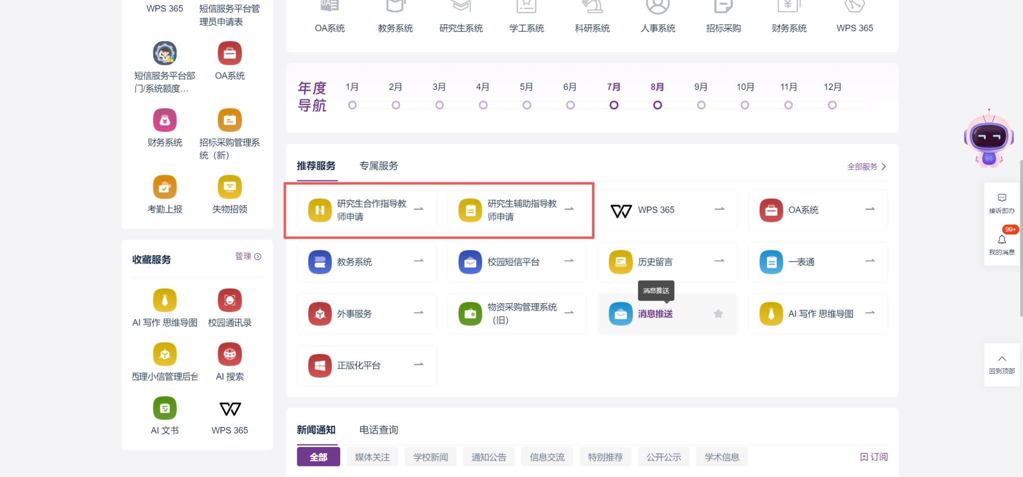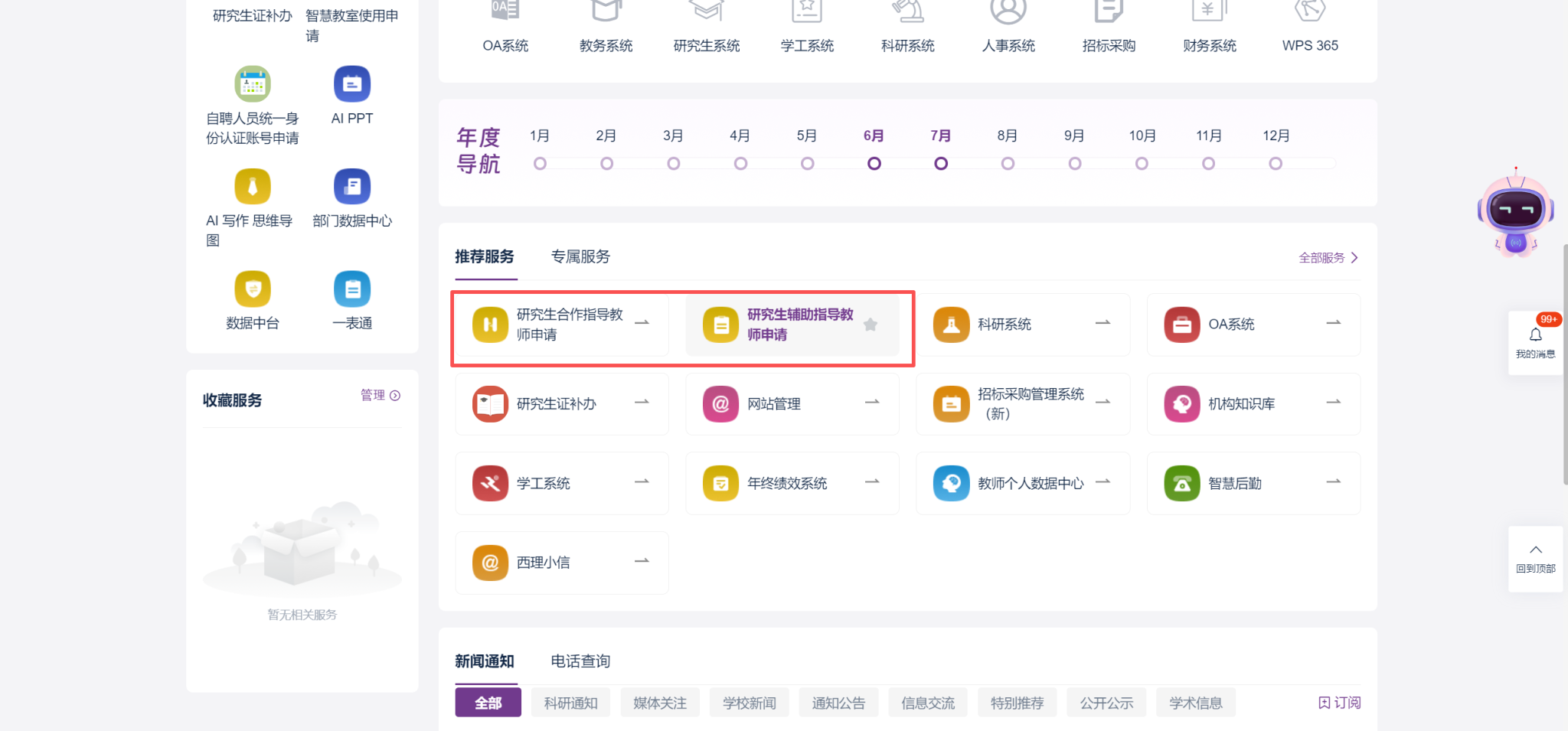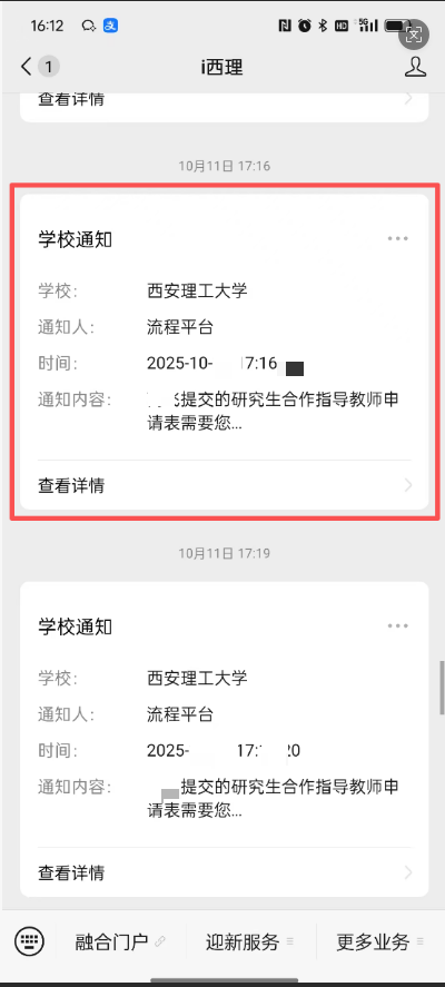 ③【申请人】申请人收到“i西理”审批完成提醒消息后,登录学校一网通办/融合门户,点击“研究生合作导师申请”或“研究生辅助导师申请”