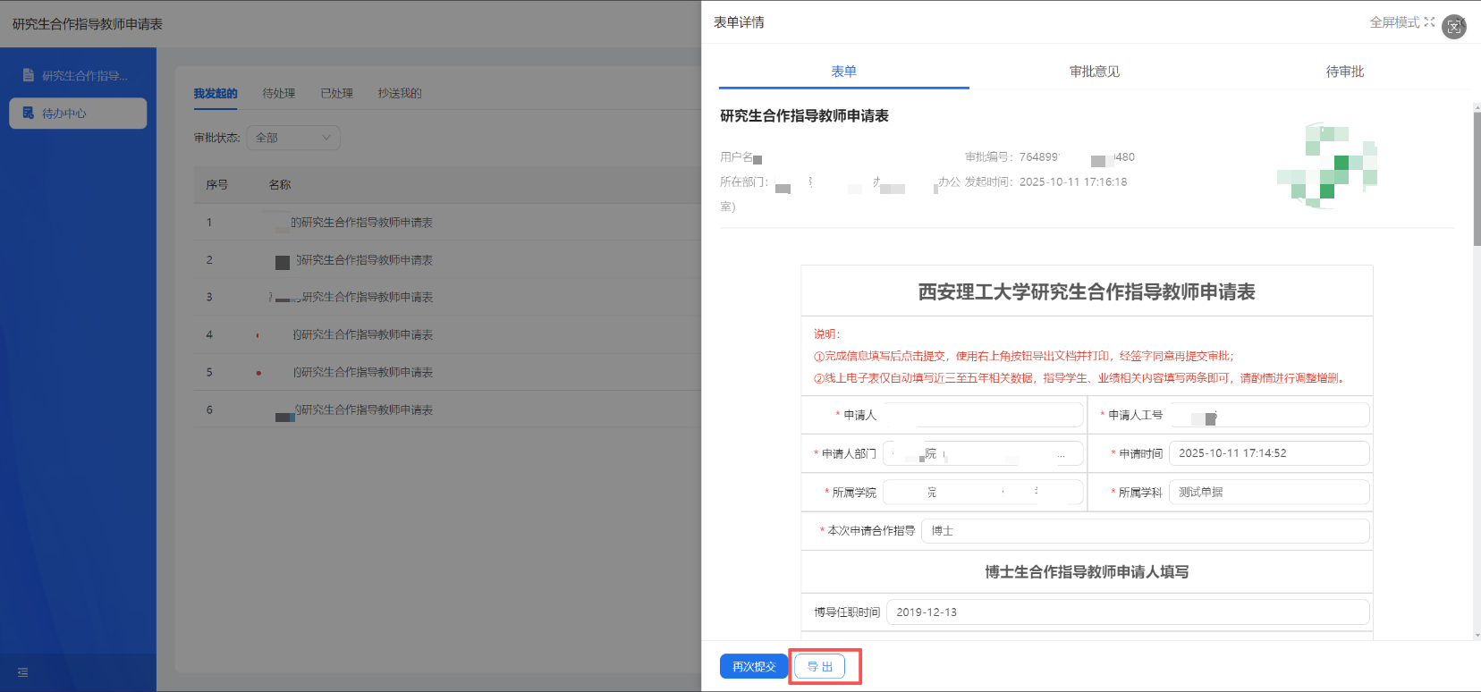 点击【导出】按钮,将审批后的文档下载到本地进行打印后,将纸质版申请表交由所在学院汇总、加盖公章;