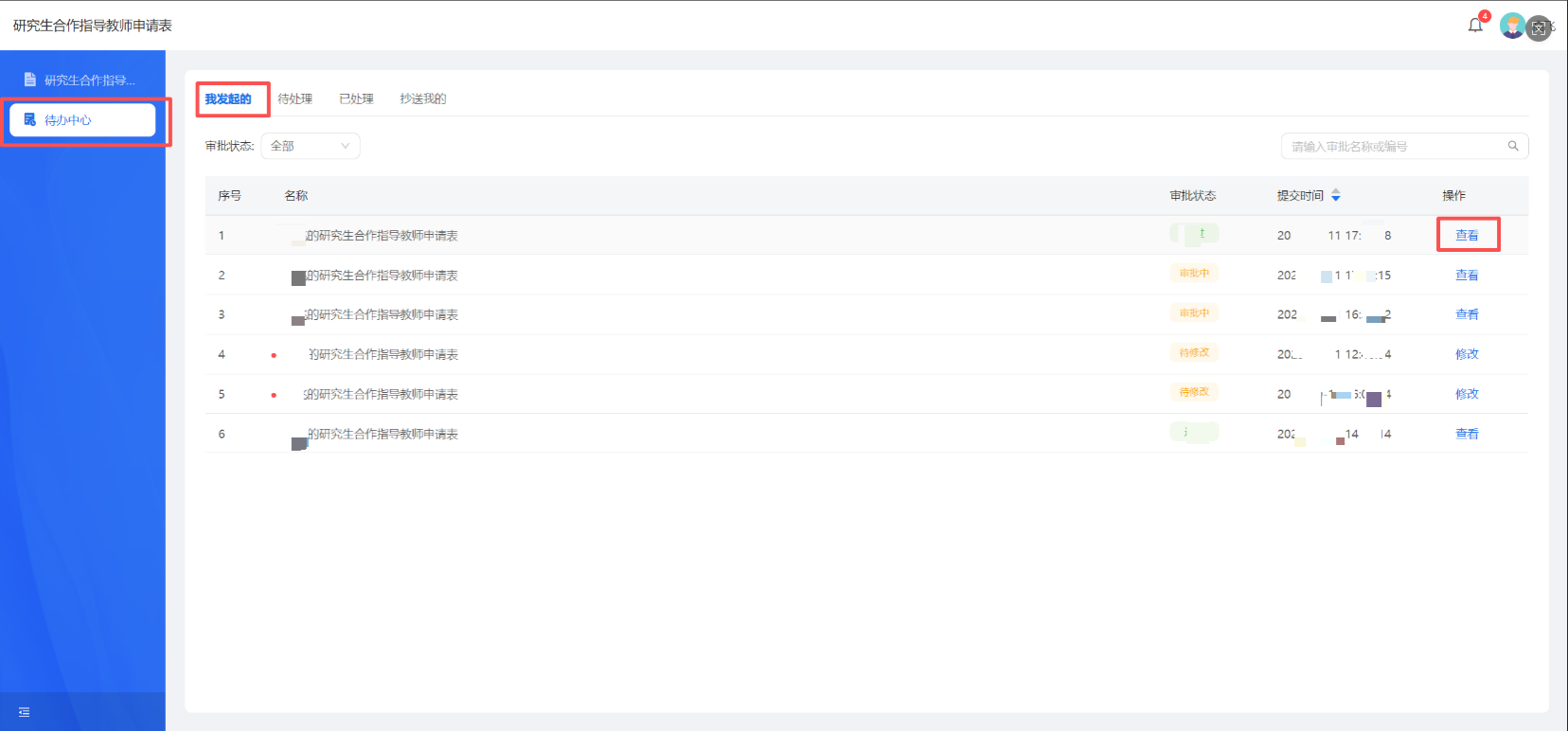 切换到待办中心页菜单,我发起的申请点击【查看】按钮