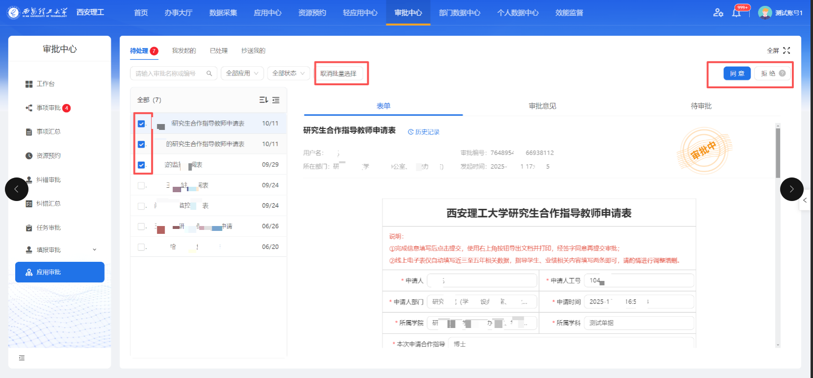 点击批量选择按钮,并勾选需要审批的单据后,点击同意或拒绝按钮进行批量审批。