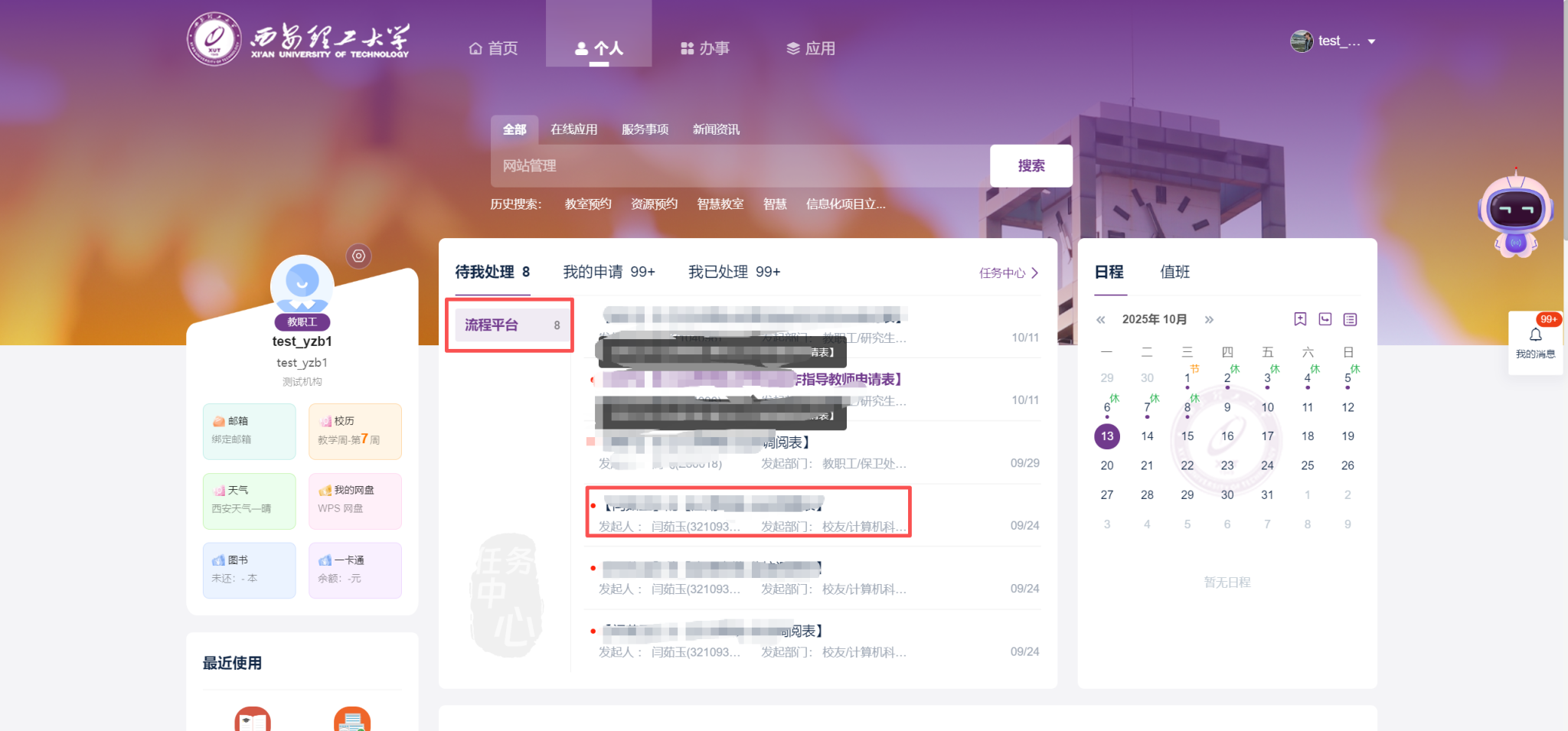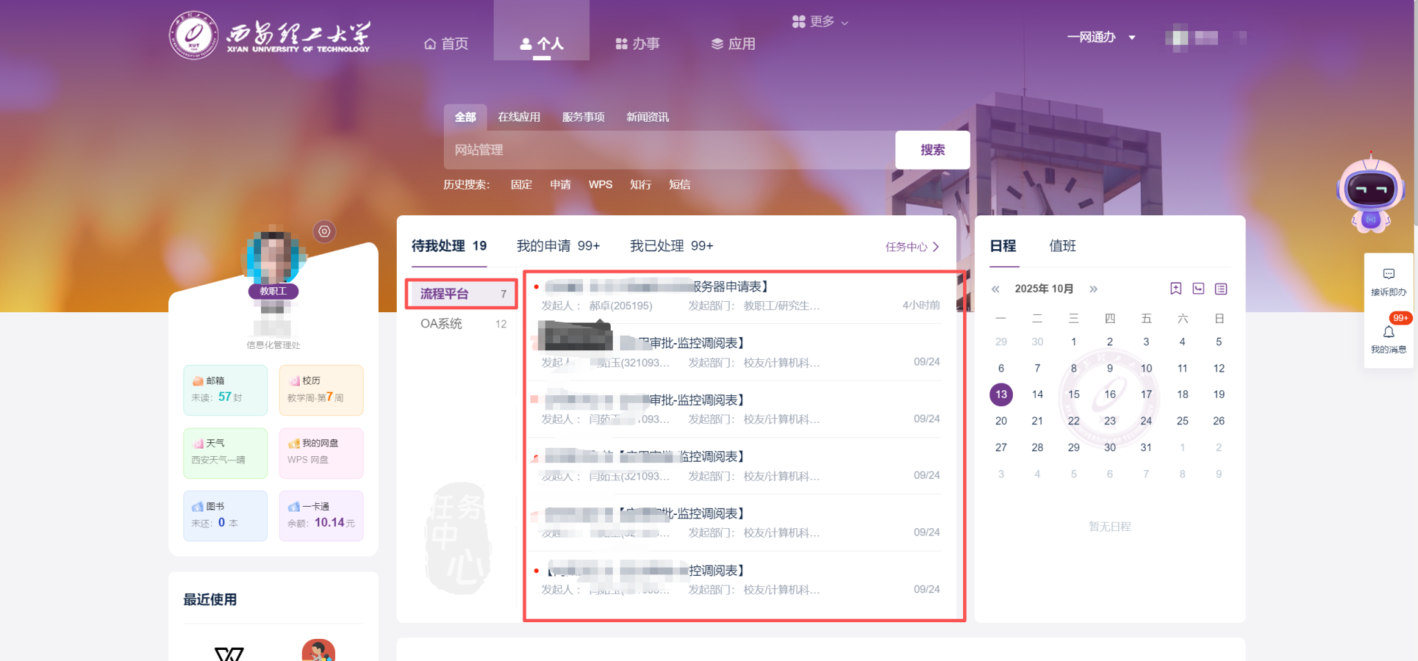 登录学校一网通办/融合门户,点击“待我处理”-“流程平台”,可进行审批;