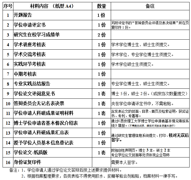 3.申请人签字的学位基本信息表(系统打印、带照片)和博士学位申请者基本情况介绍表由各学院研究生秘书单独收集、整理,材料齐全后交予学位办。答辩委员会决议复印件、成绩单原件、学位授予证明(校会后学位办发布)等材料须按照档案馆要求在派遣前装入学生学籍档案中。